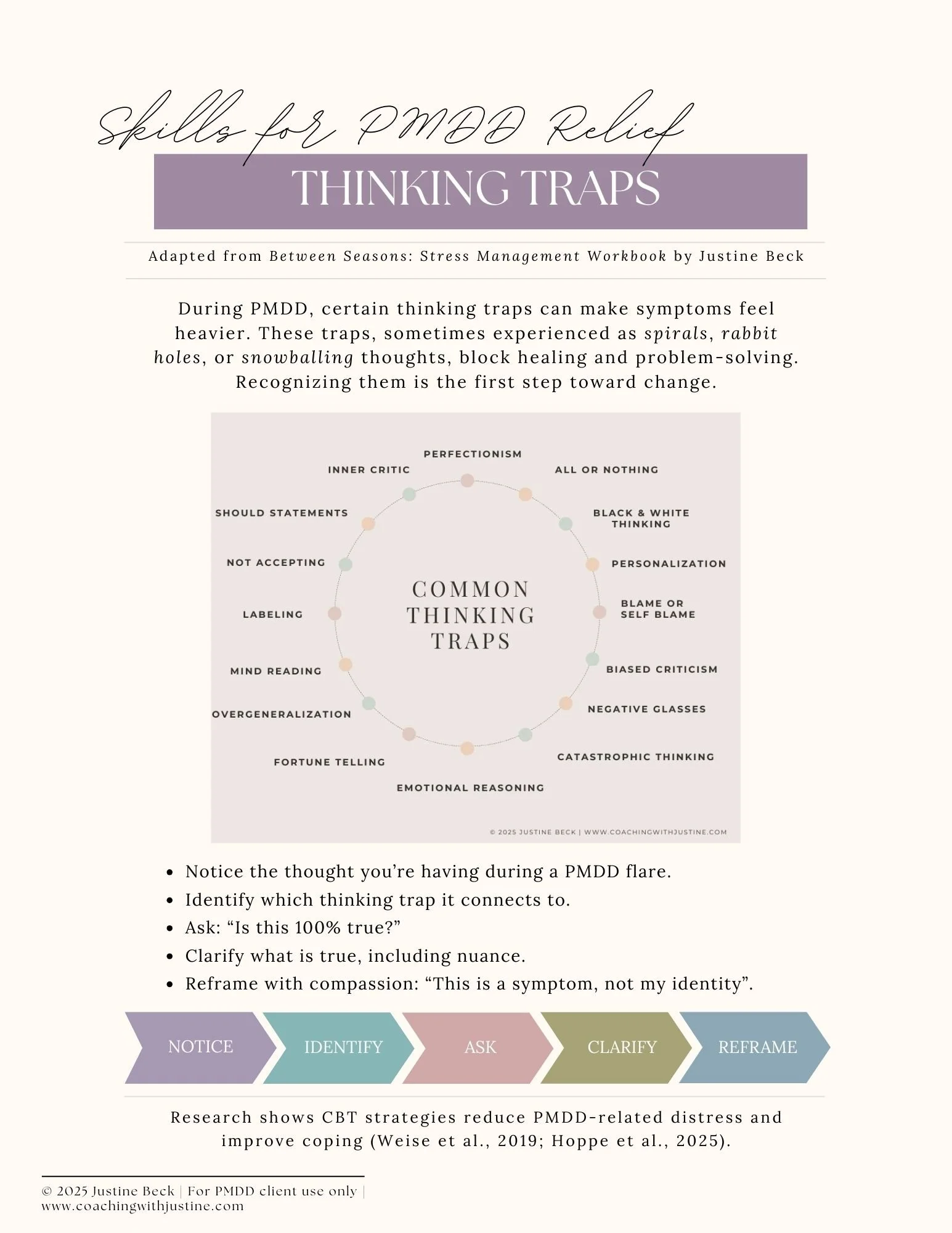 This worksheet helps you recognize and reframe the common “thinking traps” that can intensify PMDD symptoms. These traps—like perfectionism, all‑or‑nothing thinking, or catastrophic predictions—often spiral into heavier distress and block problem‑solving.